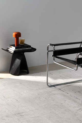 Hand-loomed with PET yarn and wool, offers high contrast in colors that dabble and reflect like the sun hitting a windy lake.